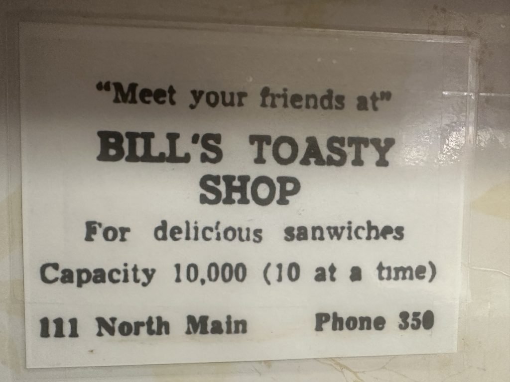 Bill’s Toasty Shop opened in May 1940 at 111 N. Main St. The original owners were Iven and Catherine Vaughan. The tiny diner has just ten counter stools and a pair of two-seater booths. One vintage sign says, “Meet your friends at Bill’s Toasty Shop…Capacity 10,000 (10 at a time.)”