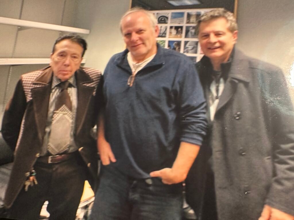 The two Carls visit WGN-AM in 2015. From left, Carl B., me, Carl G. (Photo by Cubs fan Dan Long.)